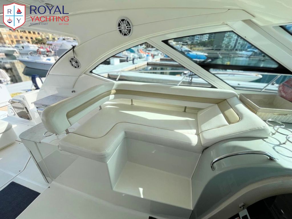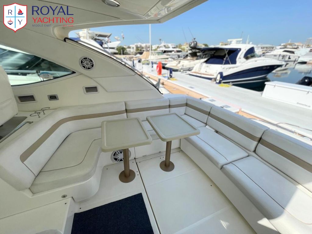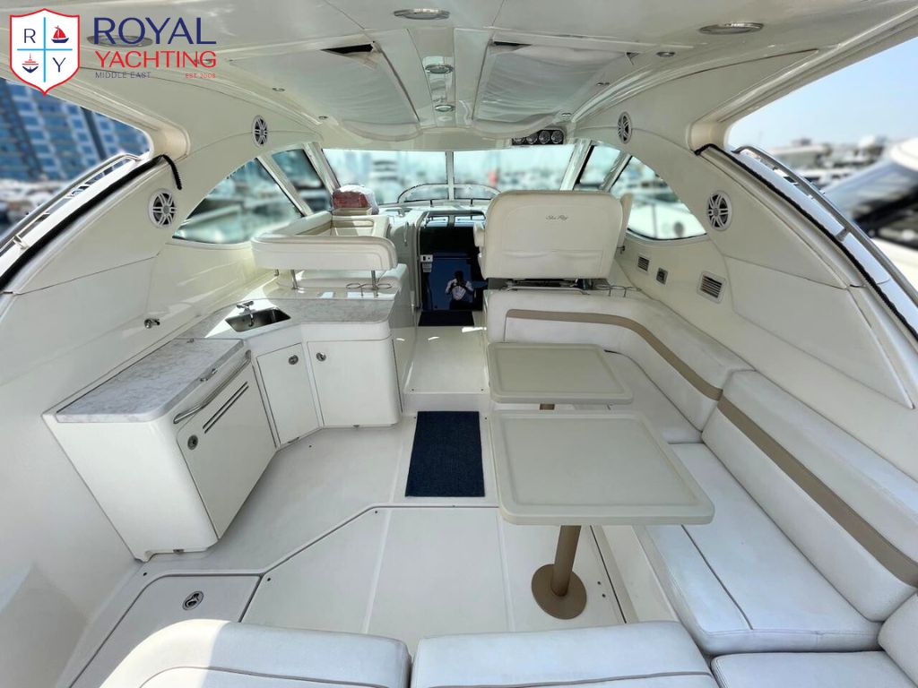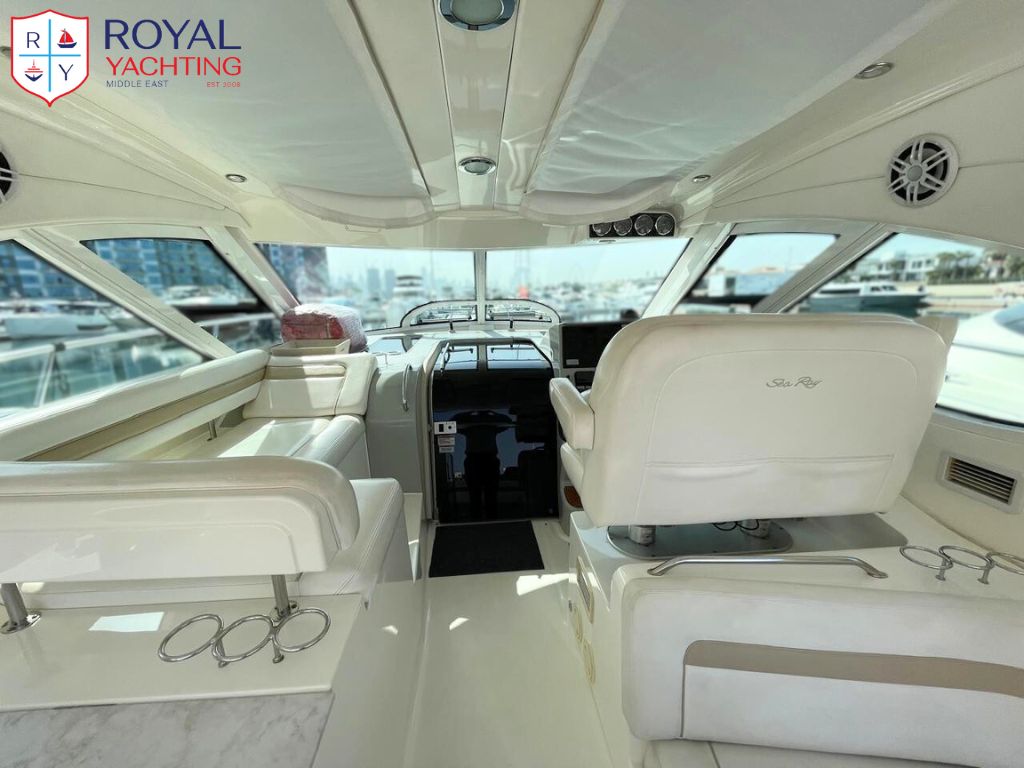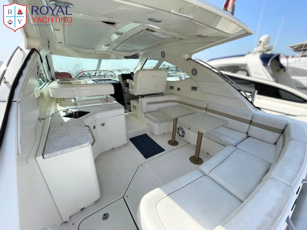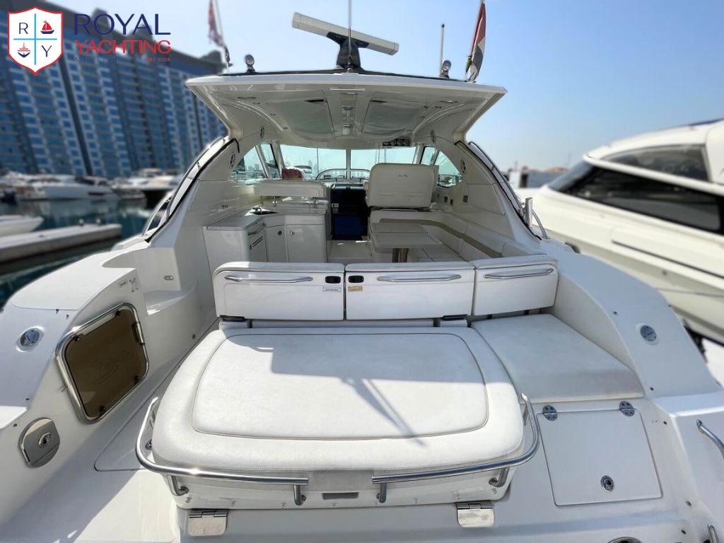A well-maintained 2009 Searay 475 Sundancer with a total length of 50.6 feet. Among other things, the yacht has a huge saloon and cockpit, two roomy cabins, and a hydraulic platform. The strong Cummins 480 HP engines that power this planing hull sport boat have less than 565 hours between them.