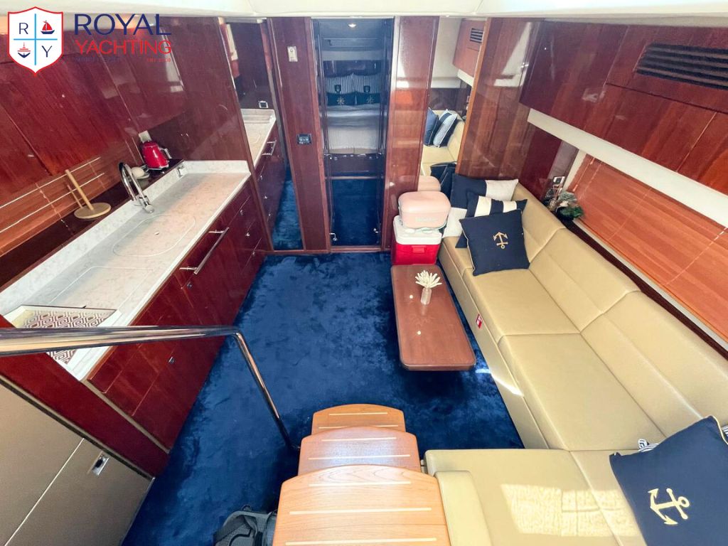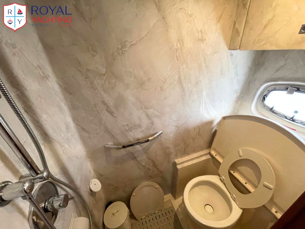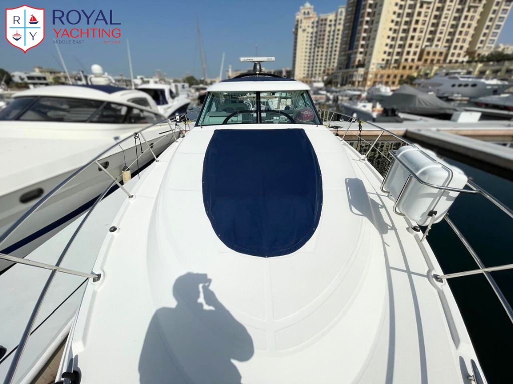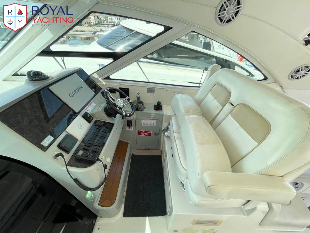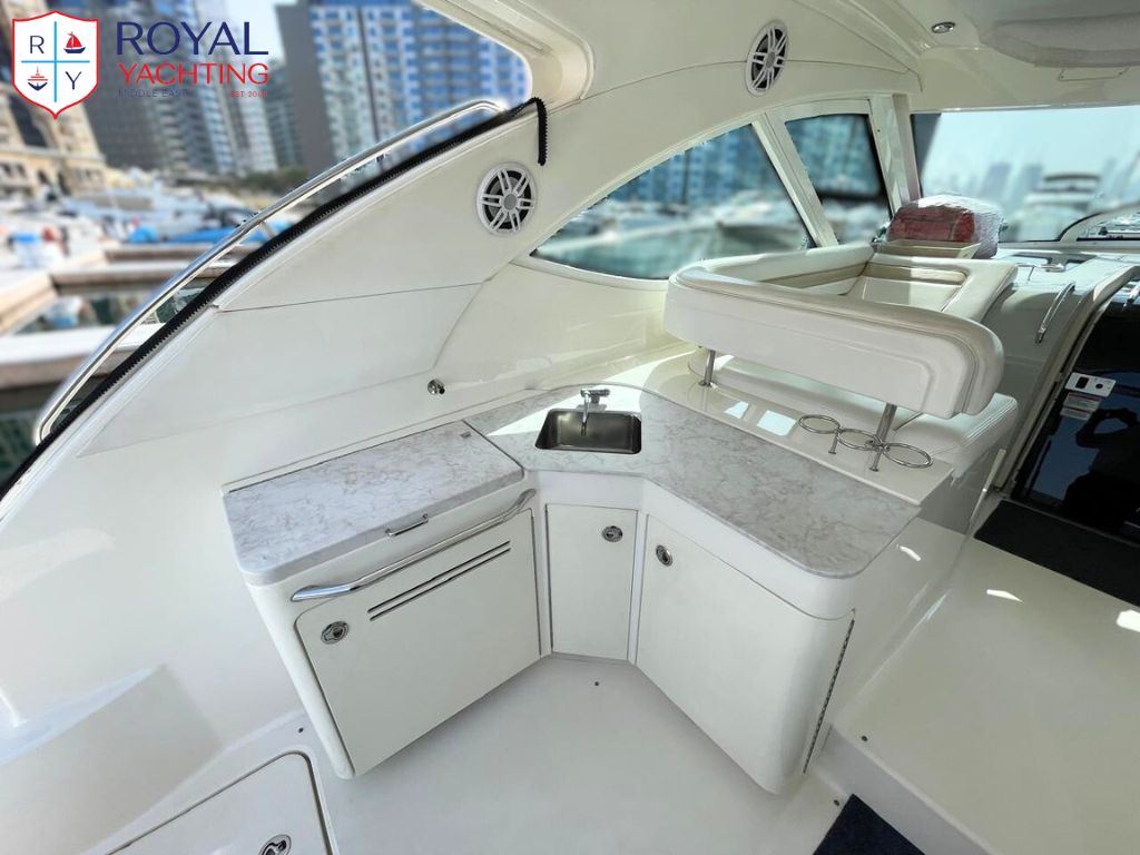 A well-maintained 2009 Searay 475 Sundancer with a total length of 50.6 feet. Among other things, the yacht has a huge saloon and cockpit, two roomy cabins, and a hydraulic platform. The strong Cummins 480 HP engines that power this planing hull sport boat have less than 565 hours between them.